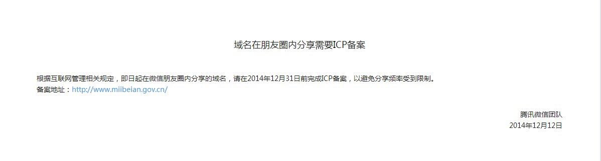 微信发布公告称,根据互联网管理的相关规定,即日起在微信朋友圈内分享域名,需在2014年12月31日前完成ICP备案,以避免分享频率受到限制。